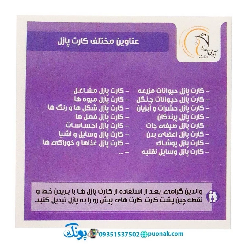 با جدا سازی آن میتوان هر کارت را به یک پازل 2 یا 4 بخشی تقسیم کردو مهارت چیدمان پازل را به کودک آموزش داد.