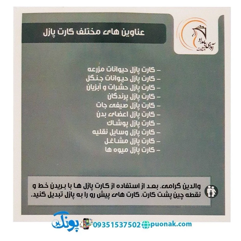 برای خرید عمده و قیمت پخش کارت آموزش مشاغل مدل کارت پازل انتشارات آوای بامداد (۲۰ کارت پازل آموزشی دو زبانه) و دیگر محصولات آموزشی و کمک آموزشی ارتباط بیشتر با ما میتوانید به سایت محصولات آموزشی و کمک آموزشی و جوایز مدرسه پونک puonak مراجعه بفرمایید.