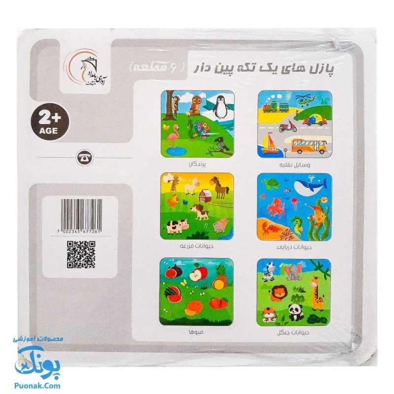 پازل های پین دار آوای بامداد۶ قطعهوسایل نقلیه ، پرندگان ، حیوانات دریایی ، حیوانات مزرعه ، حیوانات جنگل و میوه هاابعاد پازل ۲۲ × ۲۴