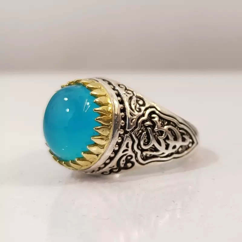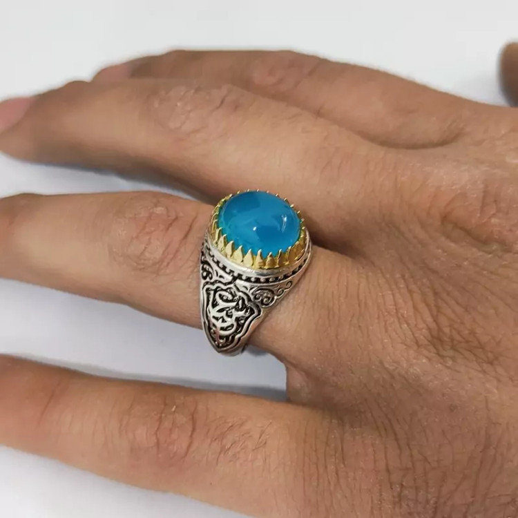 انگشتر عقیق آبی نقره مردانه طرح دورطلایی یا عباس (ع) از نقره با عیار 925 ساخته شده است. بر روی رکاب این محصول نام مبارک حضرت عباس (ع) نقش بسته است که سبب هر چه بالاتر رفتن ارزش معنوی این محصول شده است. همچنین بر روی انگشتر از سیاه قلم استفاده شده که باعث می شود تا نقش روی آن بهتر دیده شود. بر روی بازوی این انگشتر از طرح های قلم زنی استفاده شده که بیانگر ظرافت و کیفیت بالای رکاب این محصول میباشد. تاج طلایی رنگ رکاب نیز دارای رنگ ثابت است. جنس نگین سنگ عقیق آبی اصل است که رنگی روشن و جذاب دارد. عقیق گوهری محبوب و با فضیلت است و نام آن در متون و روایات دینی نیز بسیار به چشم میخورد. این انگشتر قابلیت سایز شدن برای هر سایز انگشتی را دارد