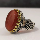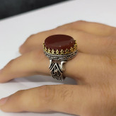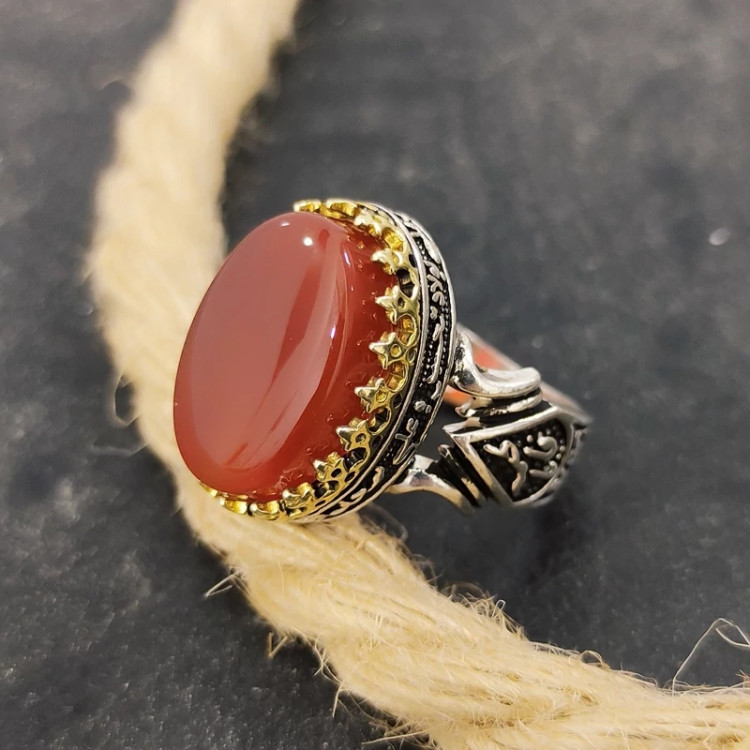 انگشتر نقره مردانه دور طلایی طرح یا علی یا فاطمه با عقیق سرخ یمنی می باشد. نگین این انگشتر عقیق اصل و معدنی می باشد. دور این سنگ چنگ های طلایی رنگ قرار گرفته که این چنگ ها با استحکام مناسبی عقیق را دربرگرفته است. بر روی یک طرف رکاب انگشتر طرح یا علی و بر طرف دیگر آن طرح یا فاطمه با خط نستعلیق نوشته شده و با سیاه قلم تزئین شده است. ترکیب طرح انگشتر سلام بر حسین ( السّلام عَلیَ الحُسَین (ع) وعَلی عَلِِِّیِ ابن الحُسَین (ع) وعَلی اوْلادِ الحُسَین (ع) و عَلی اَصحابِ الحُسَین (ع) ) بر دور رکاب انگشتر و سنگ عقیق سرخ یمنی، این انگشتر را به انتخابی مناسب برای ارادتمندان به اهل بیت تبدیل کرده است.