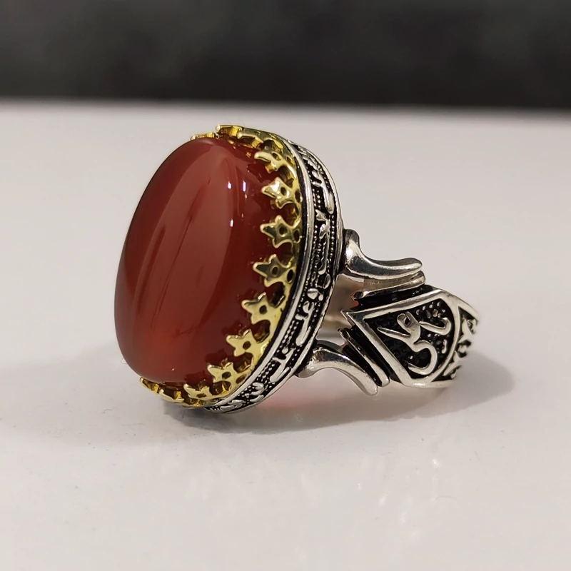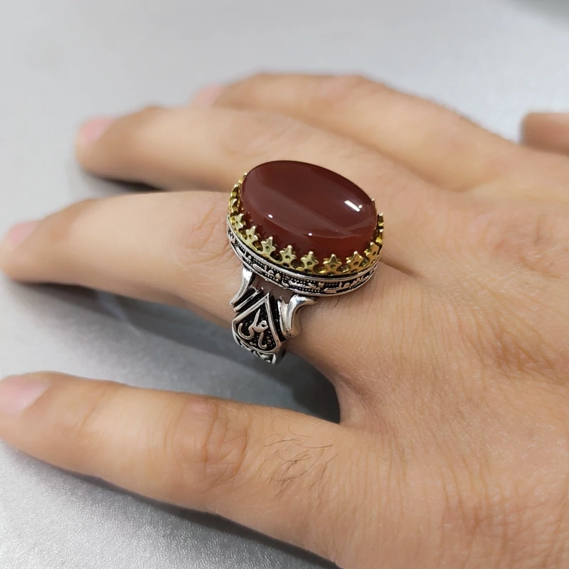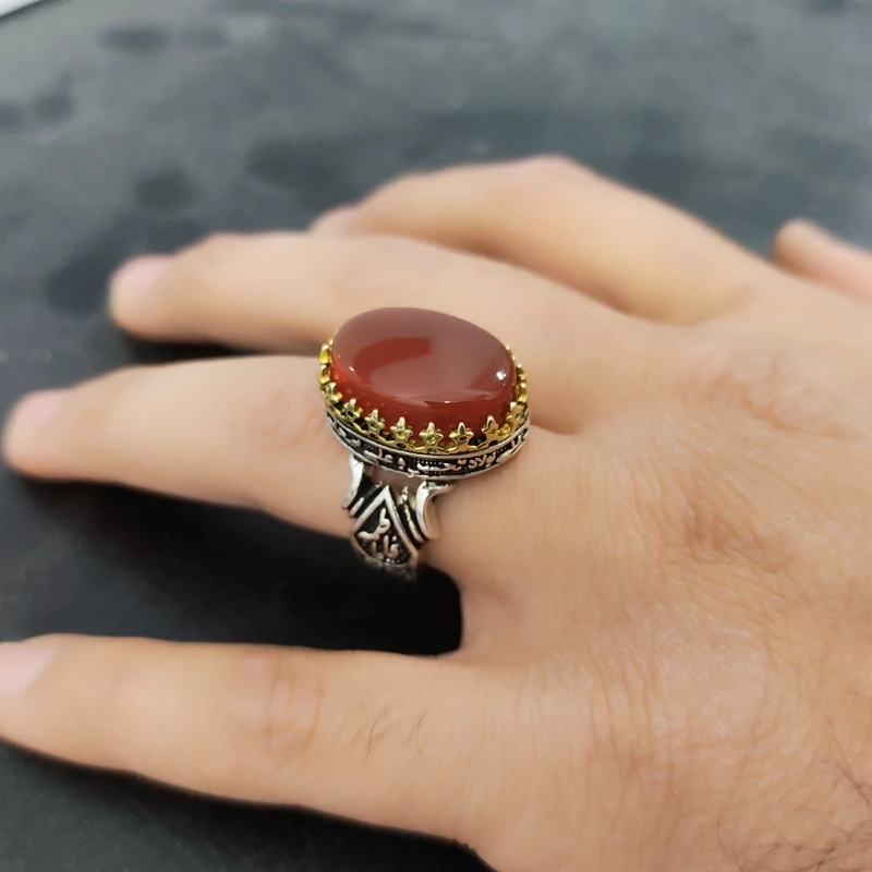 انگشتر نقره مردانه دور طلایی طرح یا علی یا فاطمه با عقیق سرخ یمنی می باشد. نگین این انگشتر عقیق اصل و معدنی می باشد. دور این سنگ چنگ های طلایی رنگ قرار گرفته که این چنگ ها با استحکام مناسبی عقیق را دربرگرفته است. بر روی یک طرف رکاب انگشتر طرح یا علی و بر طرف دیگر آن طرح یا فاطمه با خط نستعلیق نوشته شده و با سیاه قلم تزئین شده است. ترکیب طرح انگشتر سلام بر حسین ( السّلام عَلیَ الحُسَین (ع) وعَلی عَلِِِّیِ ابن الحُسَین (ع) وعَلی اوْلادِ الحُسَین (ع) و عَلی اَصحابِ الحُسَین (ع) ) بر دور رکاب انگشتر و سنگ عقیق سرخ یمنی، این انگشتر را به انتخابی مناسب برای ارادتمندان به اهل بیت تبدیل کرده است.