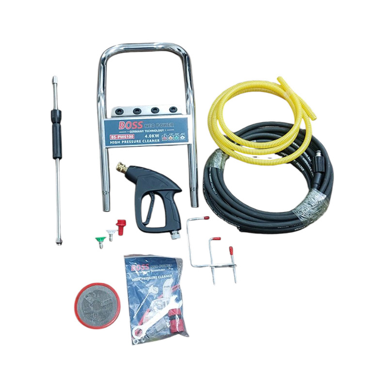 شلنگ، دستگیره، لانس (نازل)، تفنگی کارواش، فیلتر ورودی آب، آچار و لوازم یدکی