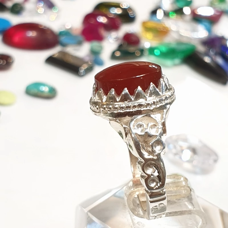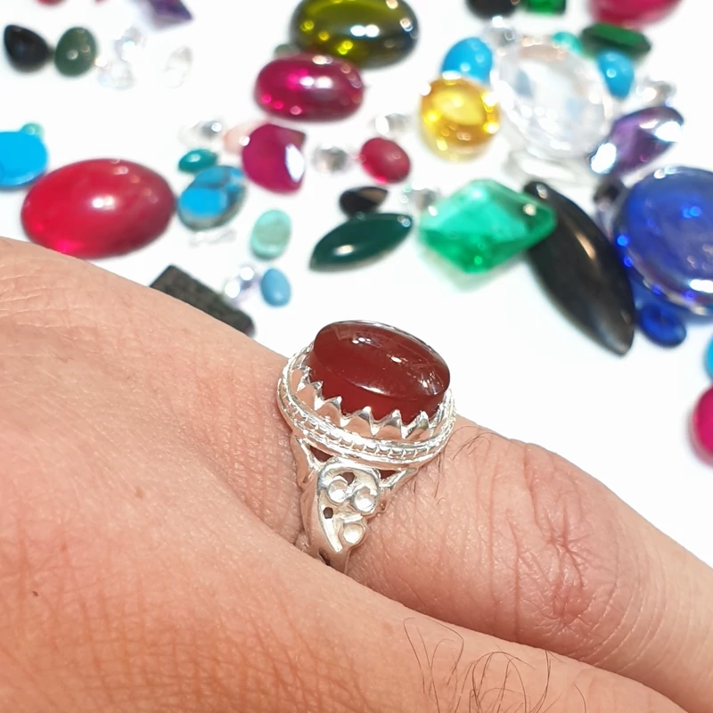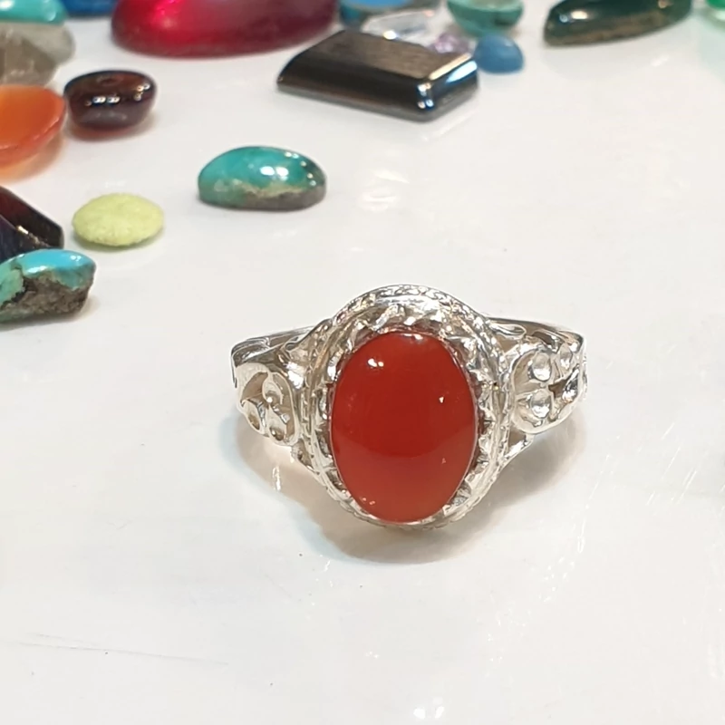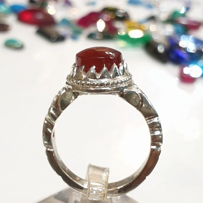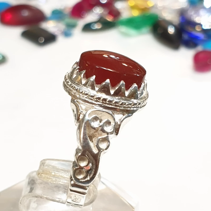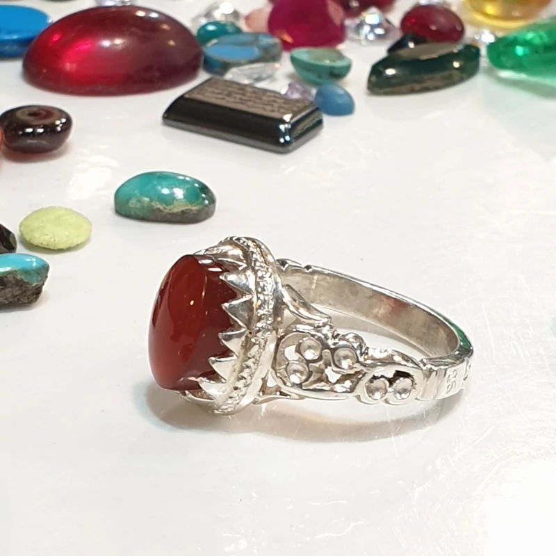 انگشتر دست ساز مشبک نقره عیار 925 با نگین عقیق سرخ یمن اصلی و فوق العاده خوشرنگ و با کیفیت ، کاری بسیار جذاب و مناسب برای جوانان و خاص پسندان