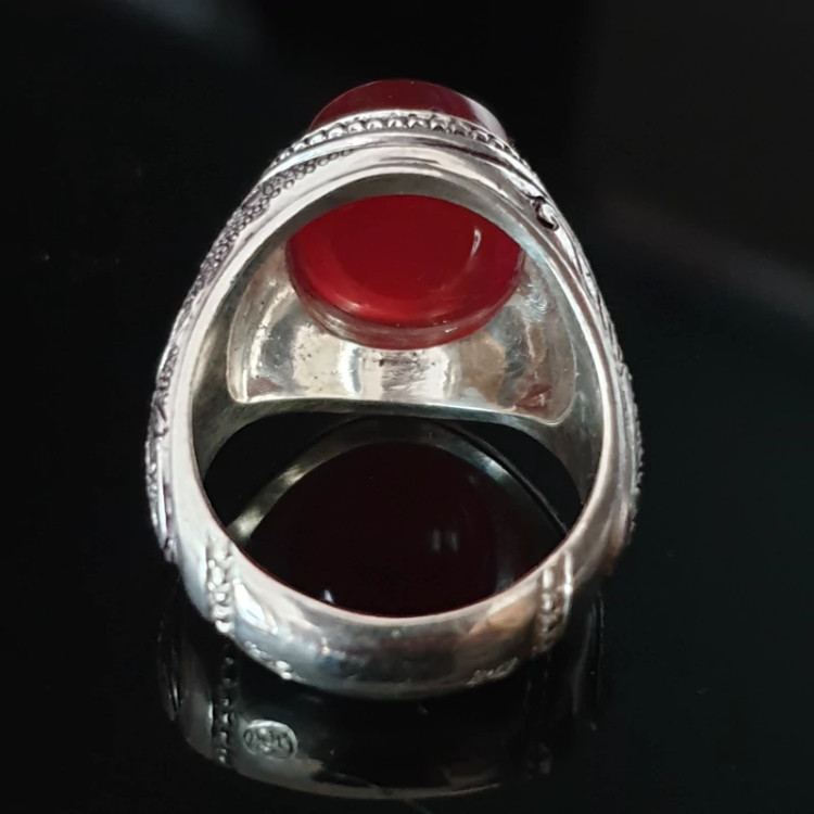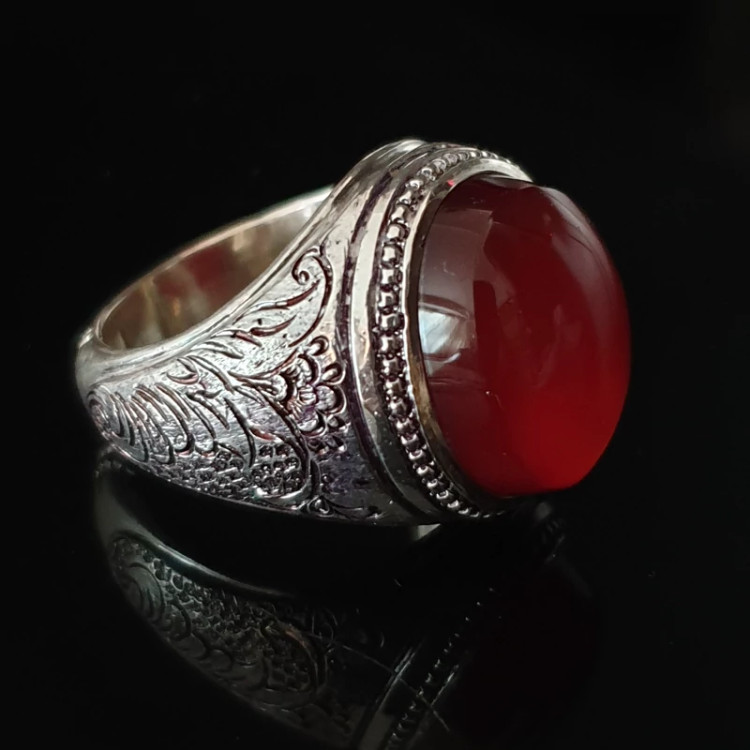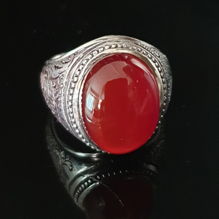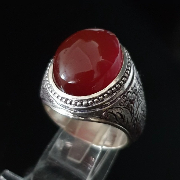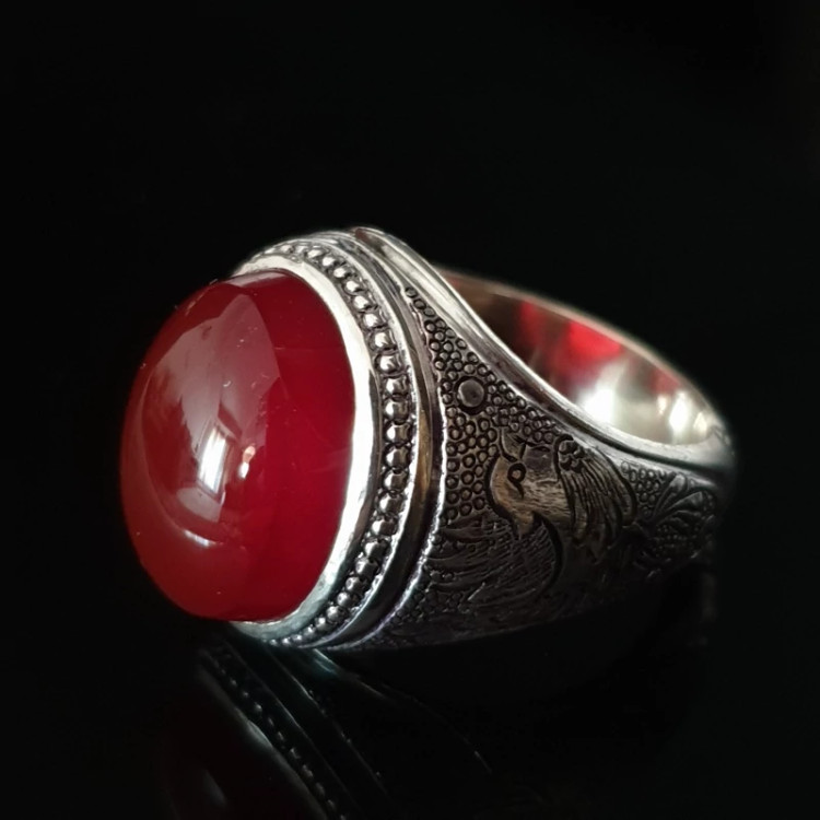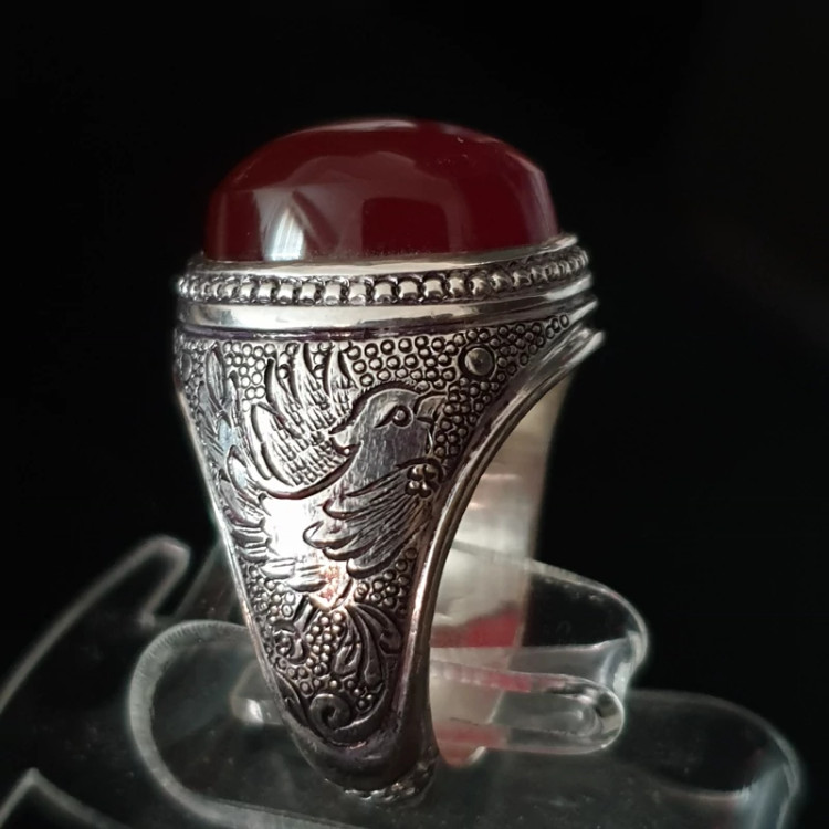 نگین عقیق سرخ یمن اصلی درجه یک با تراش و جلای عالی و رکاب نقره کار دست ساز و قلم زنی کار دست سبک گل و مرغ