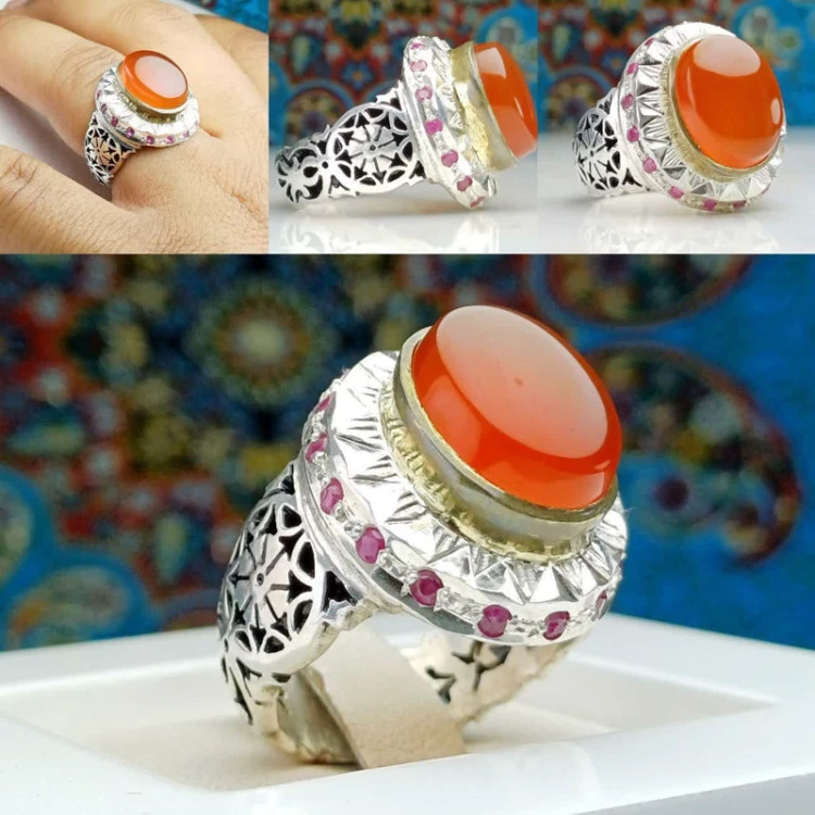 انگشتر عقیق یمنی یمن اصلی مخراج یاقوت قرمزاصلی رکاب نقره دستساز شبکه کاری نقره عیار 925ارسال رایگان
