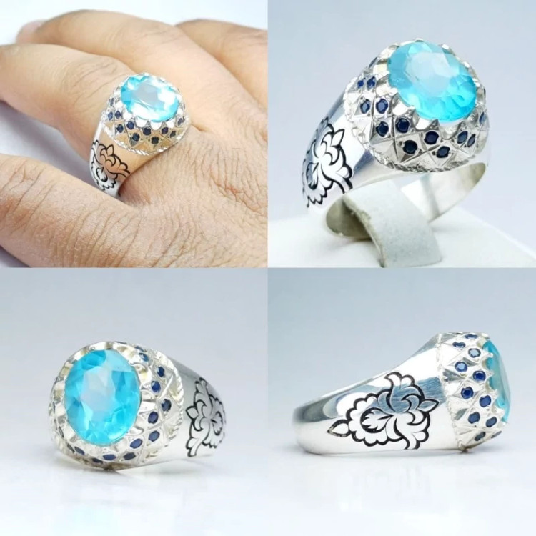 انگشتر توپازآبی سویسی اصلی رکاب نقره دستساز مخراج یاقوت کبوداصلی نقره عیار 925ارسال رایگان