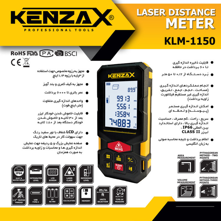 Class 2 , باتری نیمقلمی , قابلیت اندازهگیری حجم , قابلیت اندازهگیری زاویه , قابلیت اندازهگیری مساحت , قابلیت خاموش شدن خودکار , واحد اندازهگیری متر