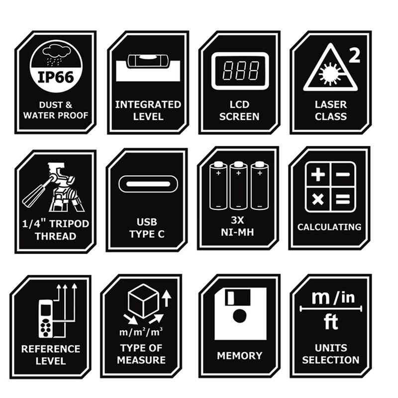 Class 2 , باتری نیمقلمی , قابلیت اندازهگیری حجم , قابلیت اندازهگیری زاویه , قابلیت اندازهگیری مساحت , قابلیت خاموش شدن خودکار , واحد اندازهگیری متر