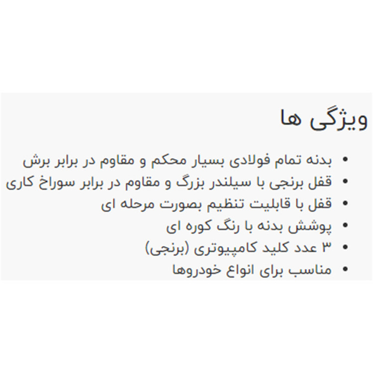 اگر شما از جمله افرادی هستید که همیشه نگران امنیت خودروی خود هستید این محصول را به شما توصیه میکینم. محصولی که در تصویر مشاهده میکنید قفل پدال مدل L700 است که توسط شرکت نووا Nova تولید میشود. این قفل پدال به لطف بدنهی فولادی که دارد به خوبی در برابر ضربه و فشار مقاومت میکند. حداقل طول این قفل پدال 35 سانتیمتر و در حالت باز شده طول آن به 42 سانتیمتر میرسد. همچنین لولهی مرکزی که موجب افزایش طول قفل پدال در حالت باز شده میشود 2.5 سانتیمتر قطر دارد. برای باز و بسته کردن این قفل 3 کلید از نوع کامپیوتری عرضه میشود که موجب بالا رفتن میزان امنیت آن شده است. از این قفل میتوان برای انواع خودروها استفاده کرد. این قفل 1.5 کیلوگرم وزن دارد. استفاده از این قفل در کنار قفل فرمان امنیت خودروی شما را افزایش خواهد داد.
