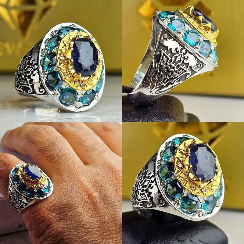 انگشتریاقوت کبود اصلی مخراج برلیان اصلی وتوپازسبزاصلی رکاب دستساز نقره عیار 925 ارسال رایگان