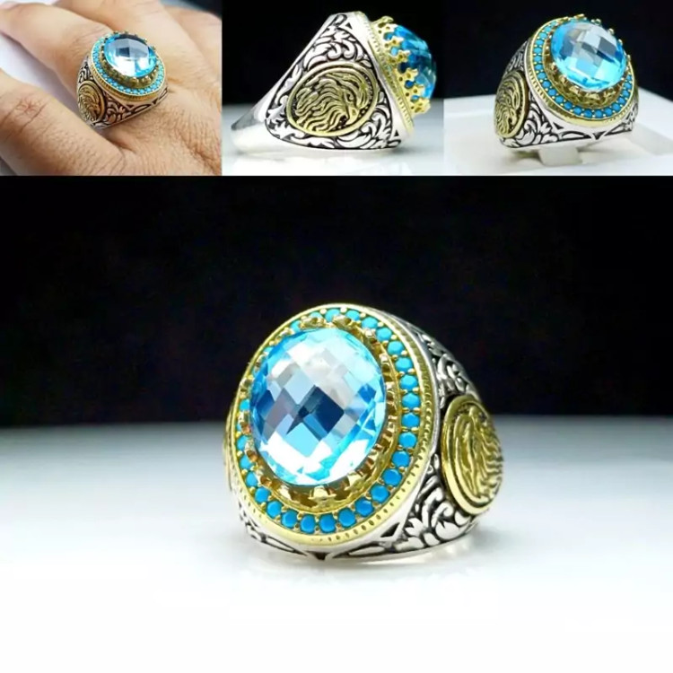 انگشتر مردانه توپاز آبی اصلی رکاب نقره چنگی دورمخراج عیار۹۲۵ارسال رایگان سایزرایگان