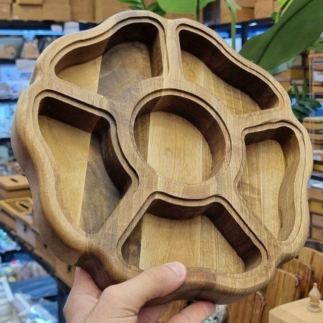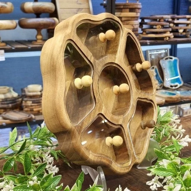 یک جعبه پذیرایی زیبا و شیک با طراحی الهامگرفته از گل، ساخته شده از چوب گردوی طبیعی. مناسب برای سرو انواع خشکبار، دمنوش و شکلات و جلوهای خاص و متفاوت به میز پذیرایی شما میبخشد.