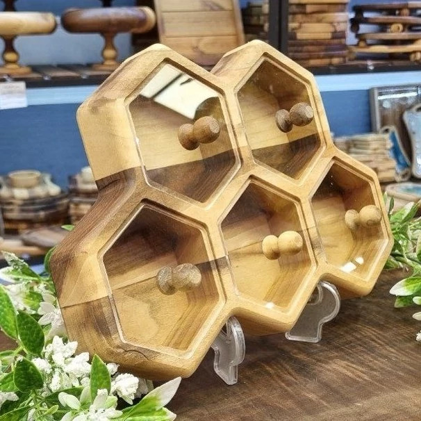 با طراحی خاص و الهامگرفته از ساختار کندوی زنبور، این جعبه پذیرایی از چوب گردوی طبیعی ساخته شده و دارای پنج بخش مجزا برای سرو انواع خشکبار، دمنوش و شکلات است. بدون وارمر، سبکتر و مناسب برای استفاده روزمره یا پذیرایی در هر محیطی.