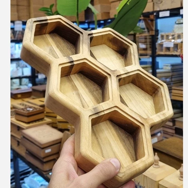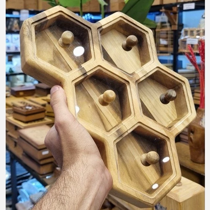 با طراحی خاص و الهامگرفته از ساختار کندوی زنبور، این جعبه پذیرایی از چوب گردوی طبیعی ساخته شده و دارای پنج بخش مجزا برای سرو انواع خشکبار، دمنوش و شکلات است. بدون وارمر، سبکتر و مناسب برای استفاده روزمره یا پذیرایی در هر محیطی.