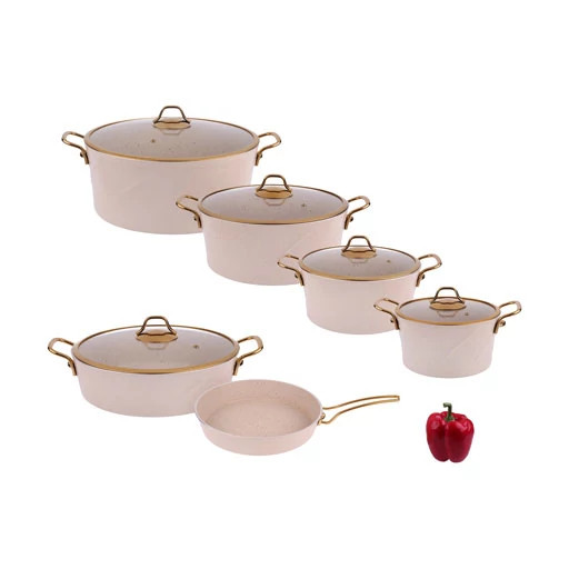 11 پارچه متنوع: شامل قابلمههای با اندازههای مختلف، تابه، زودپز و سایر ظروف مورد نیاز برای پخت و پز انواع غذاها.