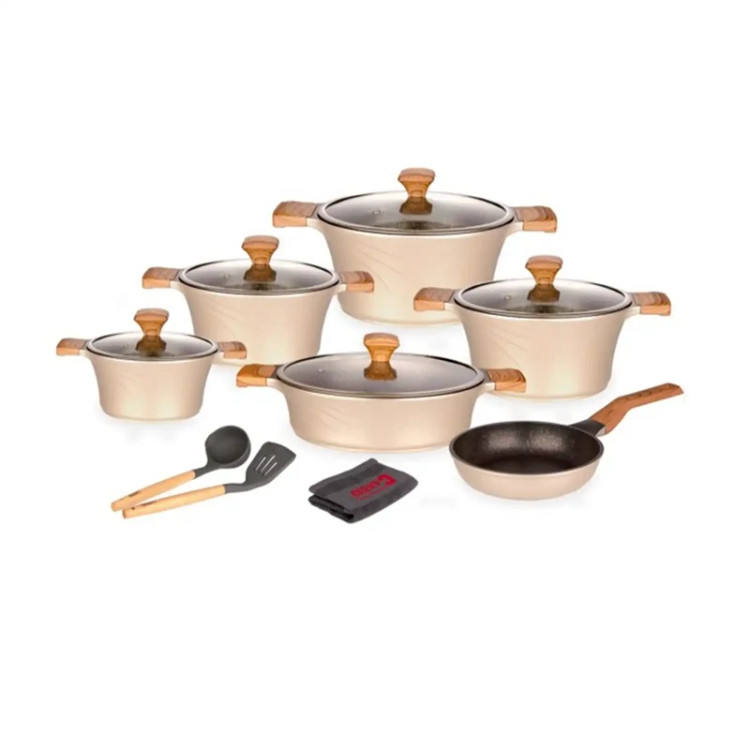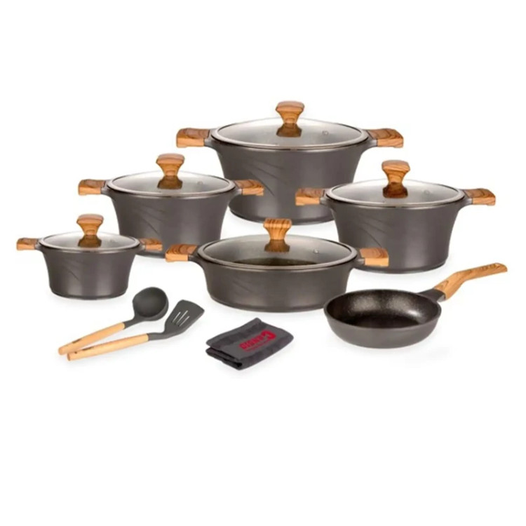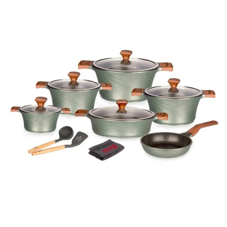 تعداد پارچه: این سرویس شامل 14 پارچه است که شامل قابلمههای در سایزهای مختلف، تابه، کفگیر و ملاقه میشود.