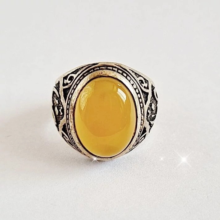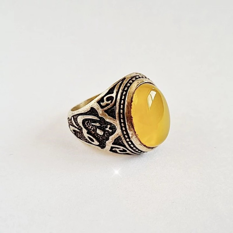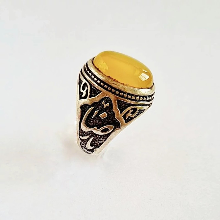 انگشتر نقره مردانه عیار ۹۲۵ نگین عقیق زرد همراه با دعای شرف شمس وزن ۹.۵۰ گرم.امکان مرجوع کردن کالا تا ۷۲ ساعت در صورت اصل نبودن
