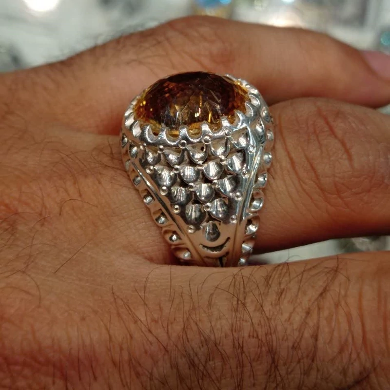 انگشترسیترین طلایی اصلی تراش نگین لیزرکات رکاب نقره دستساز شبکه پولکی نقره عیار 925 ارسال رایگان