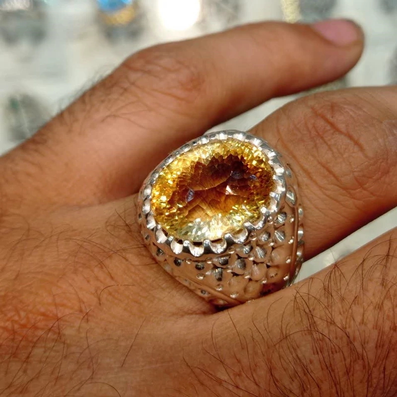 انگشترسیترین طلایی اصلی تراش نگین لیزرکات رکاب نقره دستساز شبکه پولکی نقره عیار 925 ارسال رایگان