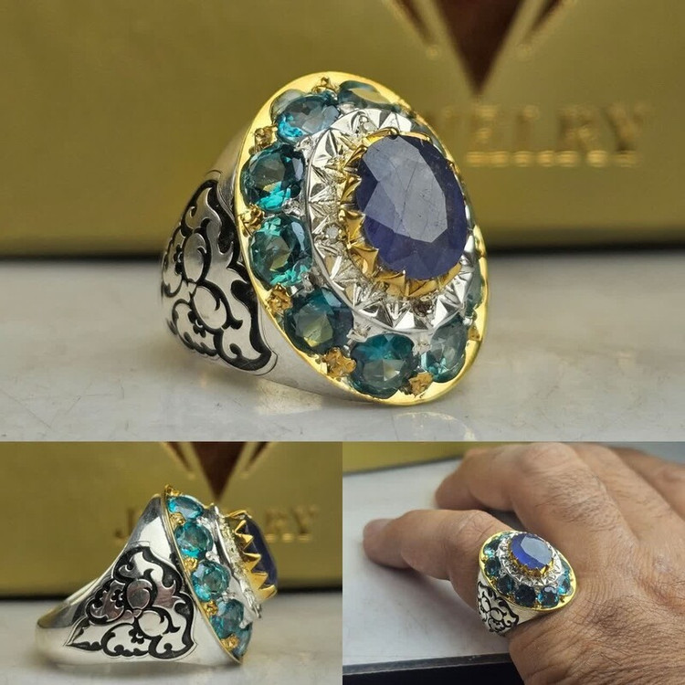 انگشتریاقوت کبود اصلی مخراج توپازسبزاصلی رکاب دستساز نقره عیار 925 ارسال رایگان
