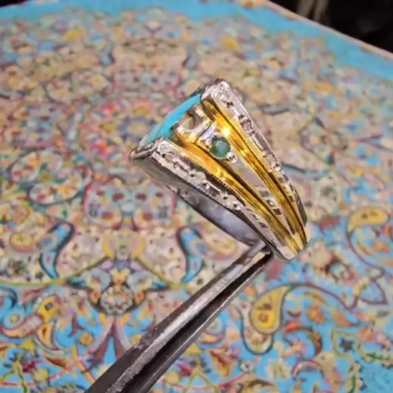 انگشتر فیروزه نیشابوری اصلی مخراج زمردزامبیا وبرلیان اصلی رکاب نقره دستساز نقره عیار 925ارسال رایگان