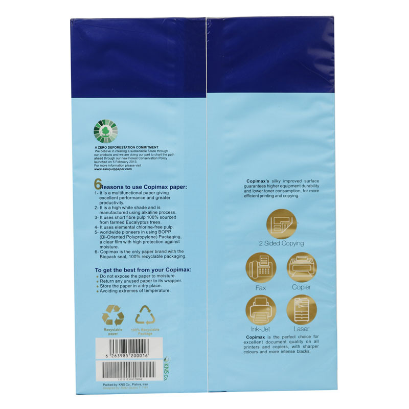 کاغذ a4 کپی مکس بسته 2500 عددی كاغذ آ4 به کاغذهایی اطلاق میشود که در ابعاد 297×210 میلیمتر یا 21×29٫7 سانتیمتر تولید و به بازار عرضه میشوند. کاغذهای A4 استاندارد و باکیفیت نظیر کاغذ A4 کپی مکس مدل Executive بسته 2500 عددی برای اهداف گوناگونی ساخته میشوند. انواع کاغذهای a4 کپی مکس برای استفاده در چاپگرهای خانگی، اداری و دستگاههای فتوکپی کاربرد دارند. از این محصولات میتوان برای چاپ کتب، سررسید و همچنین برای انواع مکاتبات اداری و سازمانی استفاده کرد. خرید کاغذ a4 کپی مکس کاغذ A4 کپی مکس مدل Executive بسته 2500 عددی با قابلیت بازیافت تولید و عرضه میشود. این ویژگی میتواند اثرات منفی ناشی از تولید کاغذها را تا حد چشمگیری کاهش دهد. شما میتوانید از کاغذ تحریر کپی مکس بسته 2500 عددی برای انواع استفادههای خانگی، اداری و سازمانی استفاده کنید؛ چراکه، این محصول مرغوب برای چاپ انواع مجله، کتاب و سررسید کاربرد دارد. این کاغذها با وزن ایده آل80 گرم و با برش لیزری طراحی و عرضه میشوند. محصولات کپی مکس از میزان پرز بسیار کمی برخوردار بوده و امکان پرینت با سرعت بالا را در اختیار کاربرین قرار میدهند. دیجی کالا کاغذ a4 کپی مکس کاغذ a4 بسته 2500 عددی مدل کپی مکس، یک محصول چندمنظوره به حساب میآید. این کاغذها از کیفیت بینظیر و درجه سفیدی بسیار بالایی برخوردار بوده و با فناوری مدرن آلکالین تولید شدهاند. خمیر استفاده شده در ساخت این محصول، از چوب درخت اکالیپتوس تهیه شده است. هماکنون میتوان نمونههای اصلی کاغذ A4 کپی مکس مدل Executive بسته 2500 عددی را از فروشگاههای معتبر نظیر دیجی کالا تهیه کرد. بسته کاغذ a4 کپی مکس کاغذ a4 کپی مکس 80 گرمی مدل Executive در بسته بندی 500 عددی، 1000 عددی و 2500 عددی عرضه شده است. بستهبندی به کار رفته در این محصول، از جنس پروبلین بوده و این قابلیت میتواند از رسیدن آب و رطوبت به محتویات درون بستهبندی جلوگیری کند. بستهبندی این کاغذ تحریر از وارد شدن آسیب و تا خوردن کاغذها جلوگیری کرده و درنهایت موجبات چاپ باکیفیت و بدون دردسر را فراهم میآورد. انواع کاغذ a4 کپی مکس کاغذ آ4 کپی مکس با بستهبندیهای متعددی به بازار عرضه میشود. همچنین تعداد کاغذهای موجود در این بستهبندیها از مقادیر 500 عددی تا 2500 عددی متغیر است.