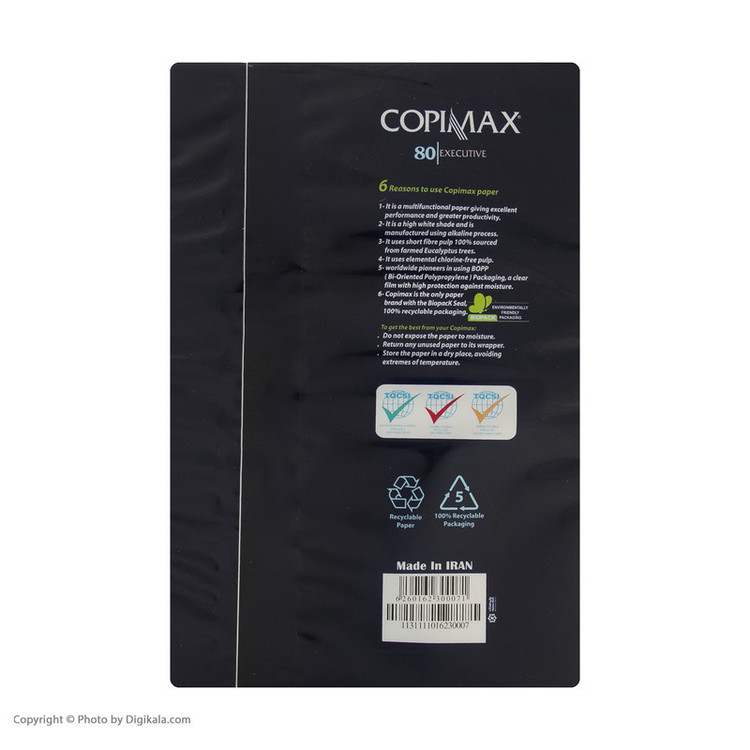 بسته 500 عددی کاغذ A4 برش خورده از کاغذ سایز A0 با وزن 80 گرم مناسب برای: - انواع پرینتر لیزری - انواع پرینتر جوهرافشان - دستگاههای فکس - دستگاههای کپی بستهبندی 100% قابل بازیافت و دوستدار محیط زیست