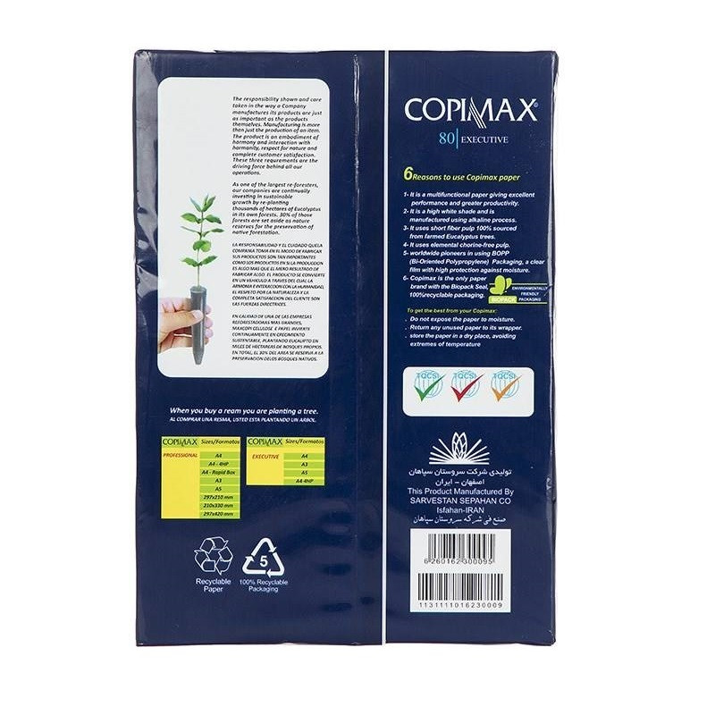 ساختهشده با فرایند آلکالاین و با استفاده از فیبر درخت اکالیپتوس با بستهبندی قابلبازیافت مناسب برای فتوکپی، پرینت، فکس قابل استفاده در چاپگرهای جوهرافشان و لیزری