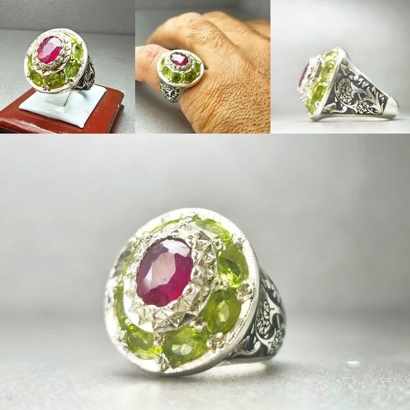 انگشتر 9نگین یاقوت سرخ قرمز وزبرجداصلی رکاب نقره دستساز نقره عیار 925ارسال رایگان