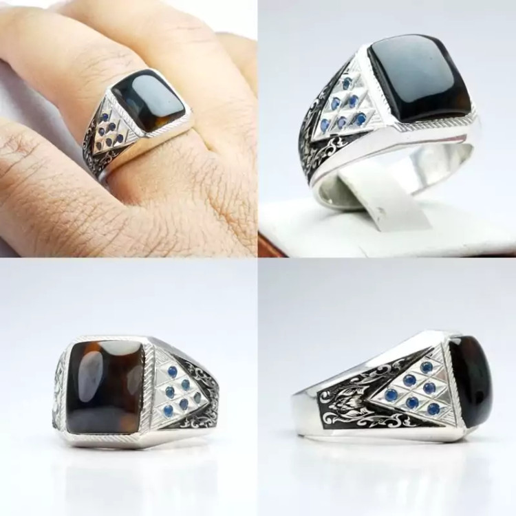 انگشتر عقیق یمنی یمن مشکی اصلی رکاب نقره دستساز مخراج یاقوت کبود نقره عیار 925ارسال رایگان