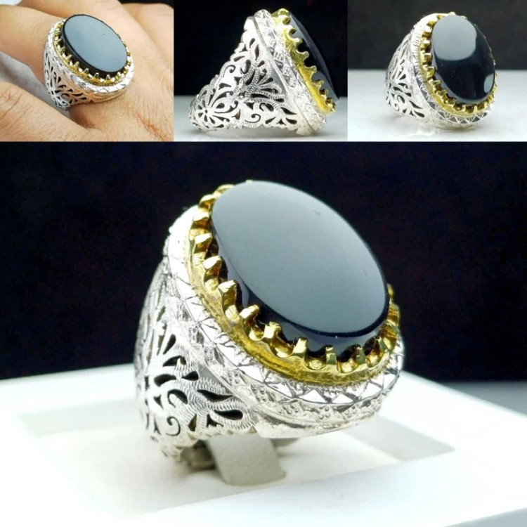 انگشتر عقیق یمنی یمن مشکی اصلی رکاب فیلی دستساز شبکه کاری نقره عیار 925ارسال رایگان