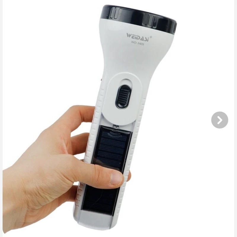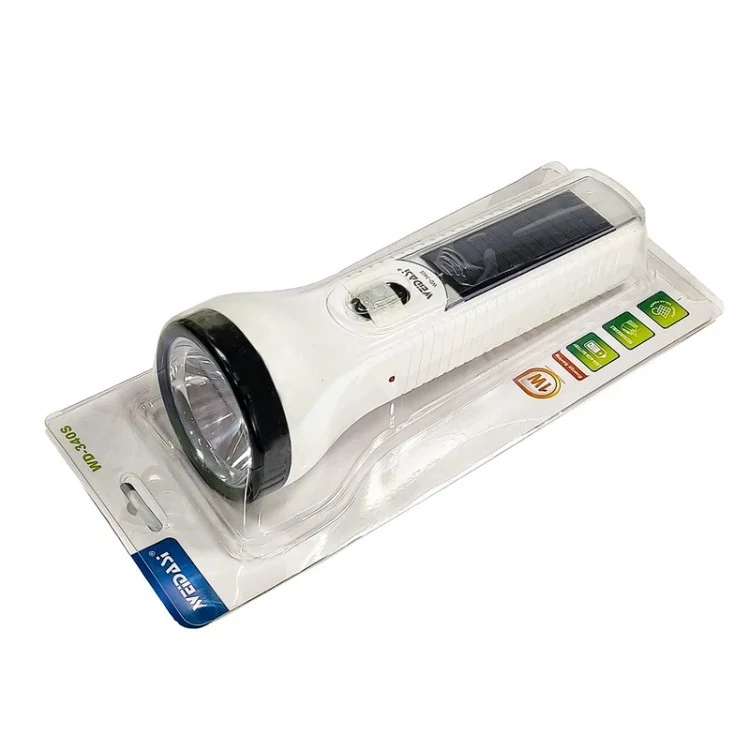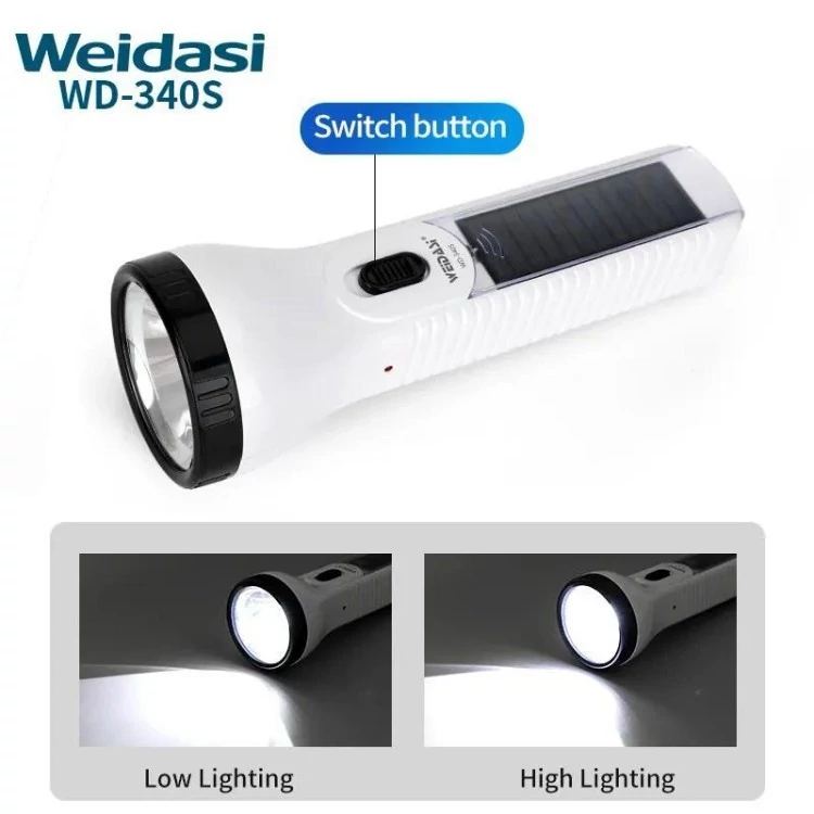 چراغ قوه مدل WD-340S ساخت برند WEIDASI یک محصول کاربردی جهت استفاده در کمپینگ، کوهنوردی، مسافرت، طبیعت گردی و… است. در داخل محفظه چراغ قوه یک عدد لامپ LED تعبیه شده که نور ساطع شده از آن مهتابی بوده و میزان روشنایی به 50 لومن می رسد، همچنین قابلیت تنظیم حالت نوردهی به صورت پر نور و کم نور داشته و توان خروجی کلی آن معادل 1 وات است. چراغ قوه مجهز به یک باتری داخلی با ظرفیت 750 میلی آمپر ساعت می باشد که مدت زمان شارژدهی آن حدود 3 ساعت به صورت نور قوی و 7 ساعت در حالت نور متعادل خواهد بود. محصول بدنه ای از جنس پلاستیک مقاوم و سبک داشته و بر روی آن یک نشانگر LED جهت نمایش وضعیت شارژ قرار داده شده است، پس از اتمام شارژ باتری، قابلیت شارژ مجدد آن به وسیله دو شاخه داخلی تعبیه شده روی محصول با اتصال به برق شهری در طی 9 ساعت وجود دارد. علاوه بر این، از دیگر ویژگی های چراغ قوه WD-340S مجهز بودن به پنل خورشیدی جهت تامین انرژی دستگاه است.