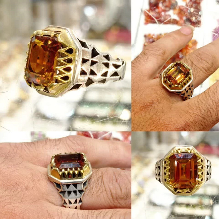 انگشتر سیترین طلایی اصلی رکاب نقره دستساز شبکه کاری نقره عیار 925 ارسال رایگان