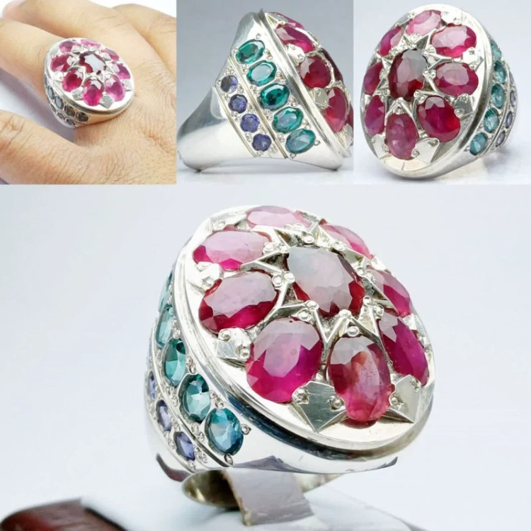 انگشتر یاقوت سرخ قرمز اصلی مخراج توپازسبز وتانزانایت اصلی رکاب نقره دستساز نقره عیار 925ارسال رایگان