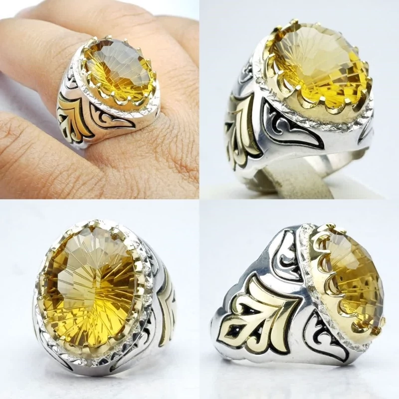 انگشتر سیترین طلایی اصلی رکاب نقره دستساز مخراج برلیان اصلی نقره عیار 925ارسال رایگان