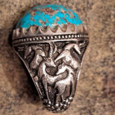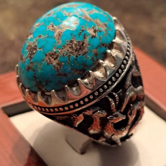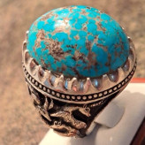انگشتر فیروزه نیشابور کلکسیونی مردانه با رکاب قلمزنی دست ساز