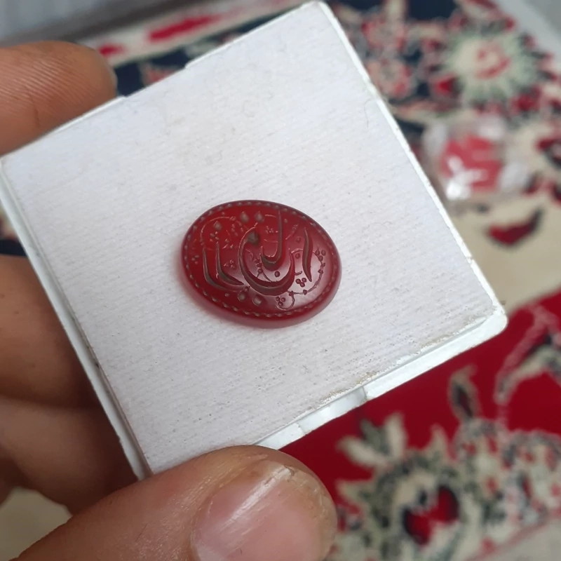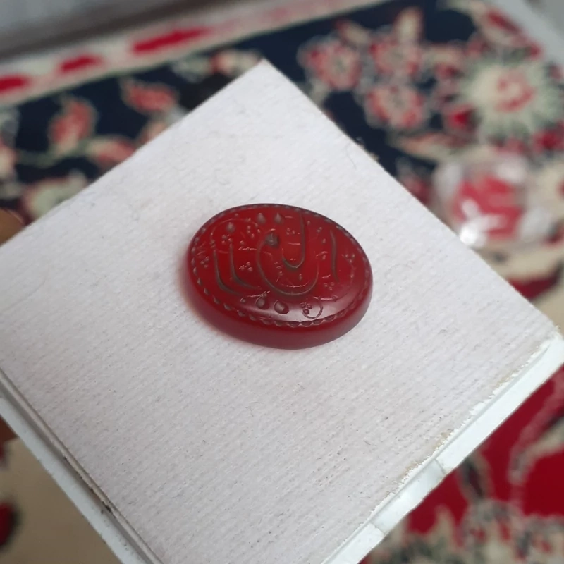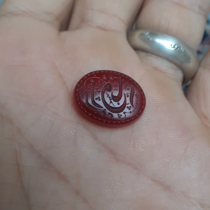 عقیق خطی چپ نویس حکاکی یا رزاق بر روی نگین عقیق سرخ اثری فاخر و تک