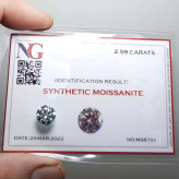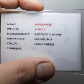 موزانایت شناسنامه دار اصل شفاف و زلال و پاک و فعال با سختی 10 با رنگ خاص و کم نظیر سبز خیلی کمرنگ نزدیک به سفید ، تراش جواهری برلیان کات دقیق و بی نقص با کیفیت عالی به وزن 2/59 قیراط ، بقیه مشخصات در شناسنامه قید شده
