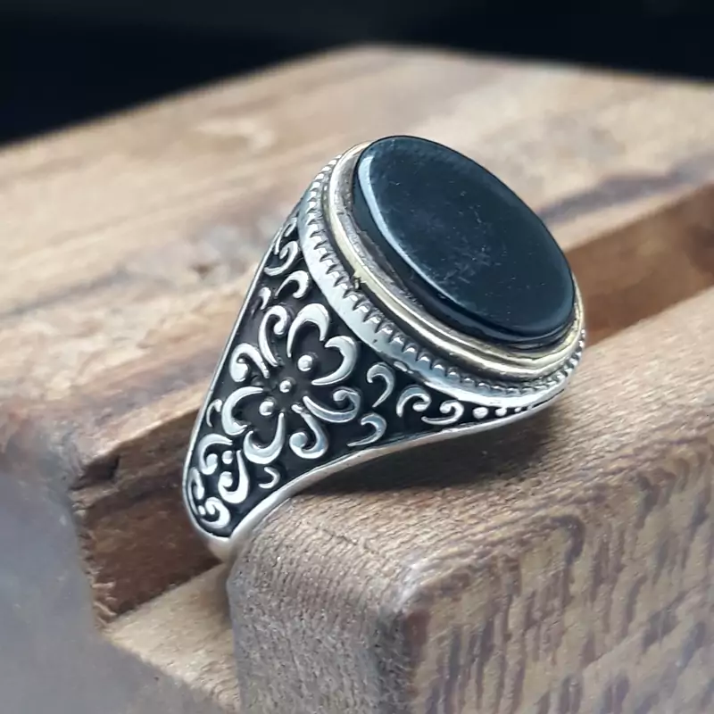 انگشتر اسپرت زیبای مردانه با عقیق مشکی و مخراج کاری شده تاج برنجی رنگ ثابت