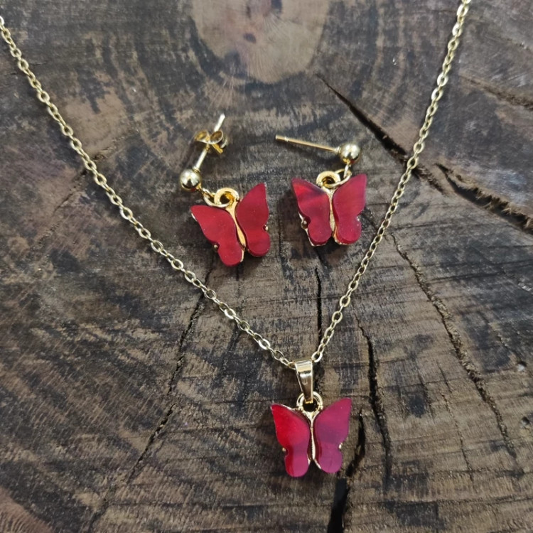 نیم ست پروانه رنگ قرمز از جنس استیل و رنگ ثابت و گوشواره های این کار آویزدار و بسیار خوش نما می باشد و لباس هم رنگ ست میشود.