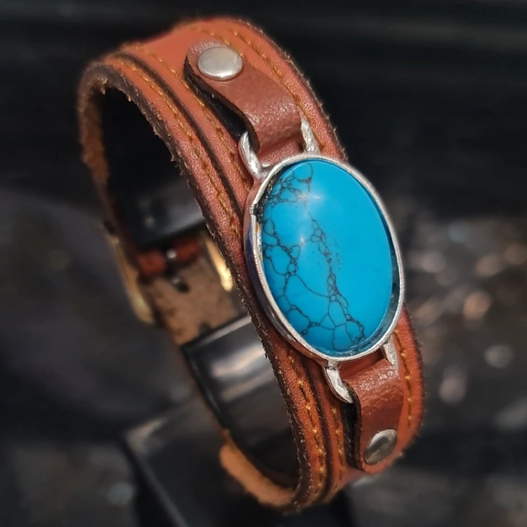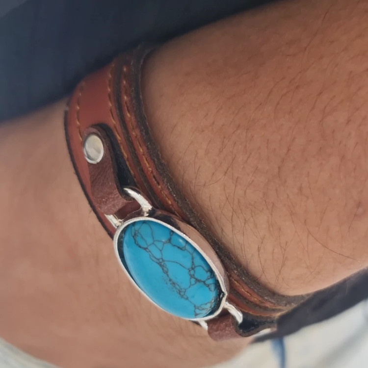 دستبند چرمی فیروزه ای دو لایه،دستبند مردانه چرمی دولایه