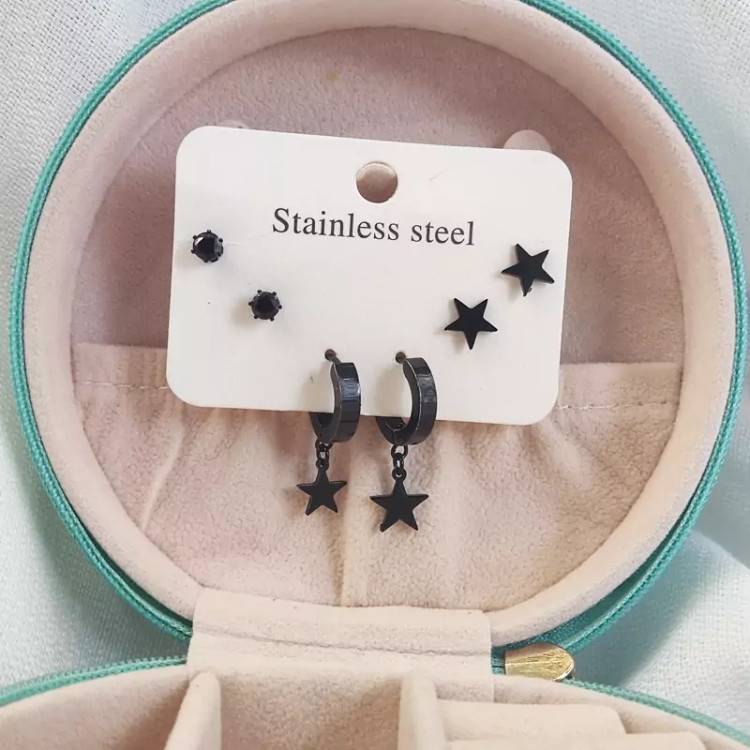 گوشواره سه جفتی ستاره مشکی استیل،گوشواره ستاره استیل،گوشواره استیل