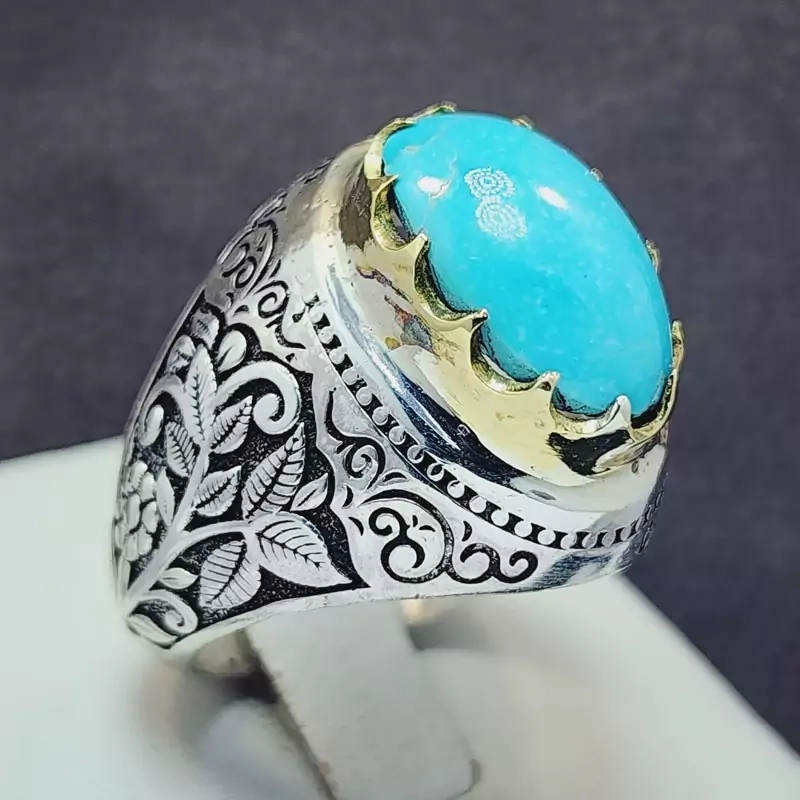 نگین فیروزه نیشابوری زیبا و خوش رنگ و بدون رگ اصل و معدنی با رکاب نقره مردانه با تاج طلایی اب طلا شده