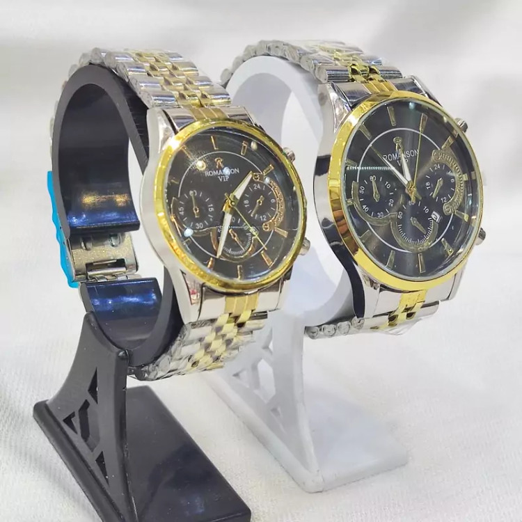 ساعت ست رومانسون دورنگ تقویم دار،ست ساعت رومانسون استیل،ست ساعت مردانه زنانه