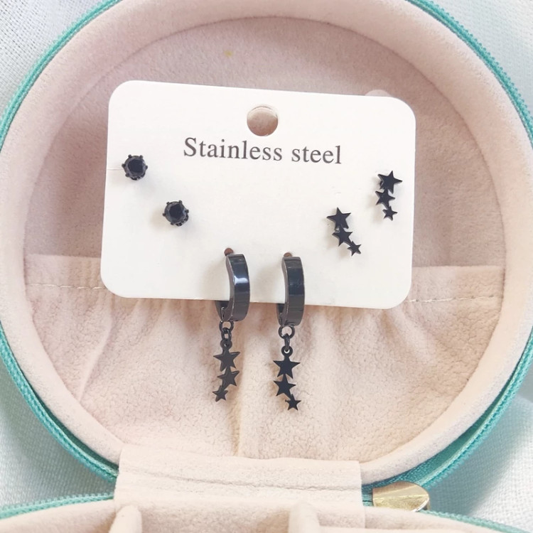 گوشواره سه جفتی ستاره استیل مشکی،گوشواره ستاره استیل،گوشواره استیل ستاره