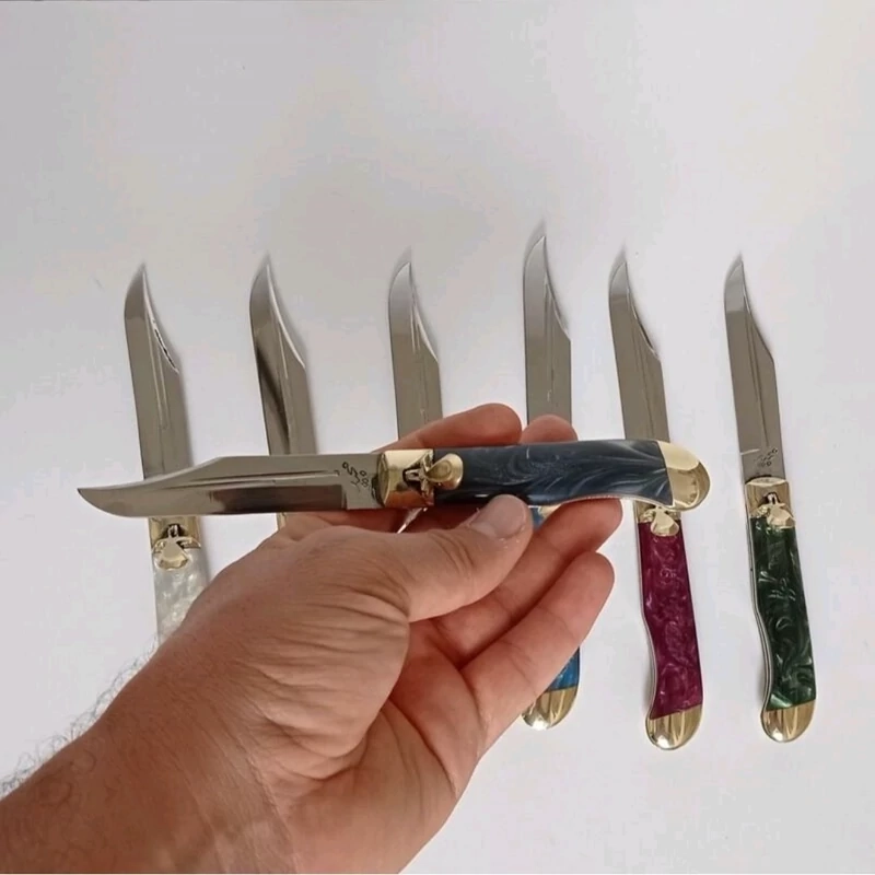 در تصویر زیر کاملا ضامن این چاقو مشخص شده است شما برای باز کردن تیغه ی این چاقو تنها کافیست با انگشت خود یک فشار به این اهرم وارد کنید و اهرم به سمت پایین برودسپس اهرم آزاد و تیغه با سرعت به بیرون پرتاب خواهد شد دقت کنید اگر فشار وارد شده به ضامن کم باشد تیغه ی شما تا نصفه باز خواهد شد و برای اینکه تیغه کاملا بصورت کامل باز شود باید در یک لحظه فشار زیادی بر روی اهرم بیاورید تا تیغه با سرعت باز شود.جنس ضامن این چاقو از آلیاژ برنج میباشد و از کیفیت خوبی نیز کاملا برخوردار است. جنس تیغه از متریال فولاد ضدزنگ میباشد. اگر بخواهیم اشاره ی دقیق کنیم فولاد استفاده شده برای این چاقو از فولاد ضدزنگ و استنلس استیل 440 میباشد که کاملا در برابر رطوبت و مایعات مقاوم است. جنس تیغه مقاومت و برندگی مناسبی دارد و میتوانید به ارحتی برای پوست کندن میوه و استفاده هایی نظیر این چنین در مسافرت و طبیعتگردی ها از این چاقو و تیغه اش استفاده کنید. نکته ی مهم اینکه تیغه قابلیت تیز شدن مجدد را کاملا دارد و بعد از مدتی استفاده که کندی تیغه کاملا امریست طبیعی مجدد میتوانید با ابزارهای لازم این کار اقدام به تیز کردن مجدد تیغه کنید. فقط نکته ای که باید اشاره کنیم به هیچ عنوان با نوک چاقو و لبه ی چاقو به هیچ جسم سخت و علل الخصوص فلزات ضربه وارد نکنید که منجر به افت کیفیت و آسیب به چاقو و تیغه ی شما خواهد شد. با نگهداری و استفاده ی اصولی به راحتی میتوانید سالیان طولانی از این چاقوی تمام دستساز ایرانی استفاده کنید و لذت ببرید.