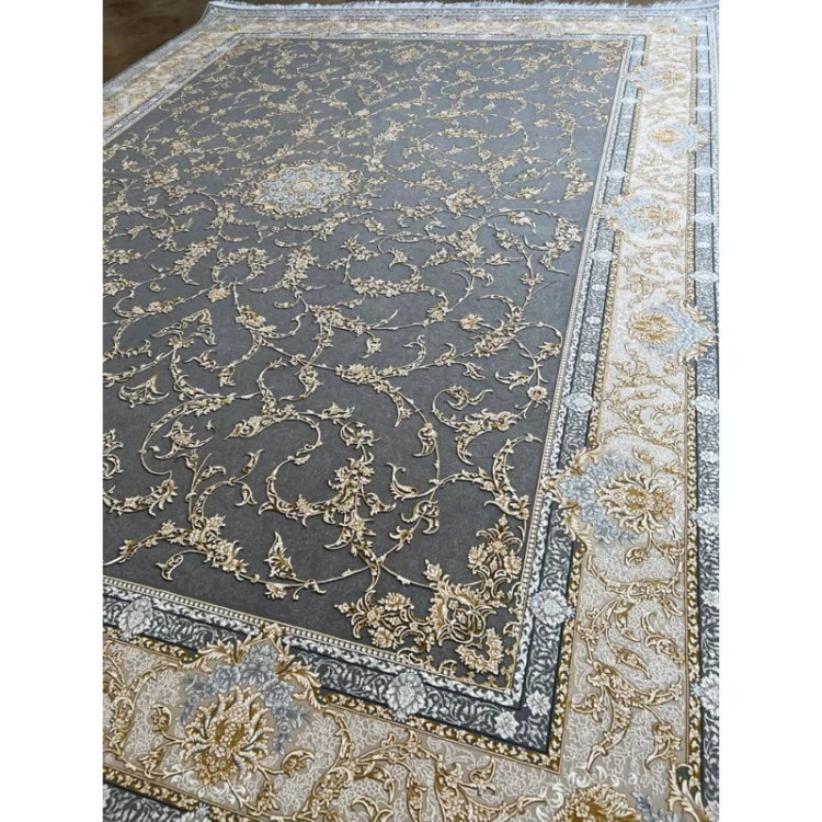 فرش ماشینی کاشان 6 متری 1200 شانه تراکم 3600نخ اکریلیک گل برجسته زمینه طوسی گل طلایی فرش افشان طوسی طلایی کیفیت عالی