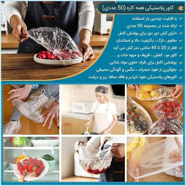 کاور پلاستیکی ظروف در بسته بندی 50 عددی محصولی بی نظیر و پرکاربرد ، دارای کش دور دوز برای پوشش کامل بشقاب و ظرف غذا بدون نگرانی بابت بیرون ریختن آن، بنابراین همواره پوششی کامل برای ظرف حاوی مواد غذایی در برابر غبار، آلودگی ، تماس حشرات و … خواهد بود. استفاده چند منظوره به عنوان کاور بهداشتی مو، کاور کفش، کاور ظروف و میوه جات داخل یخچال، کابینت، روی میز، درون آشپزخانه، سبد پیک نیک، خودرو و یا هر جای دیگری که نیاز داشته باشید می توانید از آن استفاده کنید.