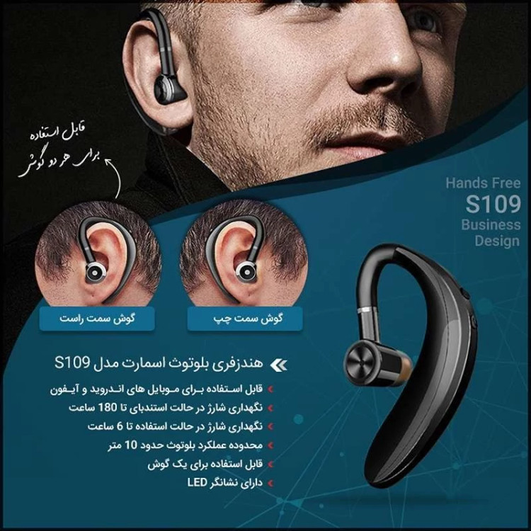 هندزفری بلوتوث اسمارت مدل S109 یک هندزفری بسیار شیک میباشد که به شکل خلبانی طراحی شده است.بنا به ماهیتی که هندزفریها دارند، روزانه مدت زمان زیادی در گوش کاربر قرار میگیرند و از اینرو طراحی ارگونومیک از اهمیت زیادی برخوردار است. سرگوشی هندزفری بلوتوث اسمارت مدل S109 جنس سیلیکونی دارد و بسیار نرم است که کاربری خوشایندی را رقم میزند. هندزفری بلوتوث اسمارت مدل S109 دارای اتصال بلوتوث است و چون به کابلی متصل نیست، دیگر با کابلهای در هم تنیده روبرو نخواهید شد. با مجهز شدن این دستگاه به میکروفن قابلیت مکالمه فراهم شده است. کیفیت مکالمه و وضوح صدا برای یک مدل رده میانی، قابل قبول هستند. از دیگر ویژگی های هندزفری بلوتوث اسمارت مدل S109 می توان به : دارای کلیدهایی برای مدیریت تماسها و موسیقی، اتصال برد 10 متری، سازگار با سیستمعاملهای اندروید و iOS اشاره کرد.